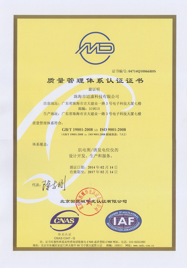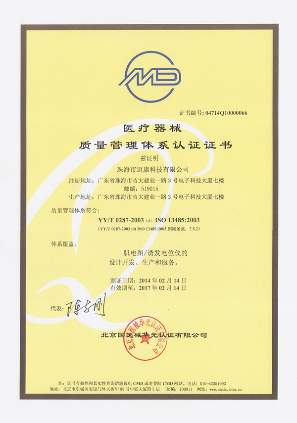 2013年12月,北京国医械华光认证有限公司(原中国医疗器械质量认证中心)认证专家组进驻我公司,对各部门贯彻质量管理体系工作情况及生产车间现场管理方式进行了全面认证审核,专家组成员一致认定迈康科技的质量管理体系符合认证要求,运行有效,同时予以通过YY/T0287-2003 idt ISO 13485:2003和GB/T 19001-2008 idt ISO 9001:2008两项质量管理体系认证。
